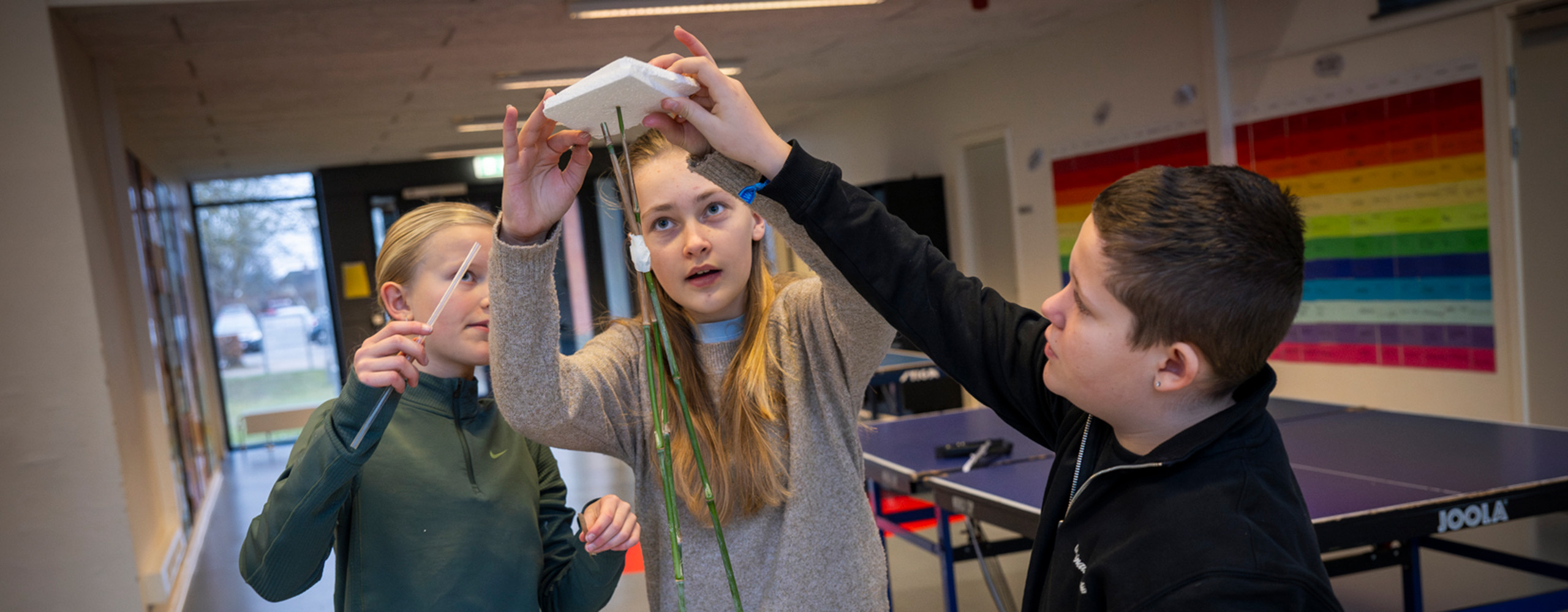 De arbejder med opgaven Byg Højt, og det foreløbige resultat står foran dem en onsdag formiddag i januar. Et højt pyramidelignende udsigtstårn bygget af bambuspinde sat sammen med farverige elastikker, snor og malertape.