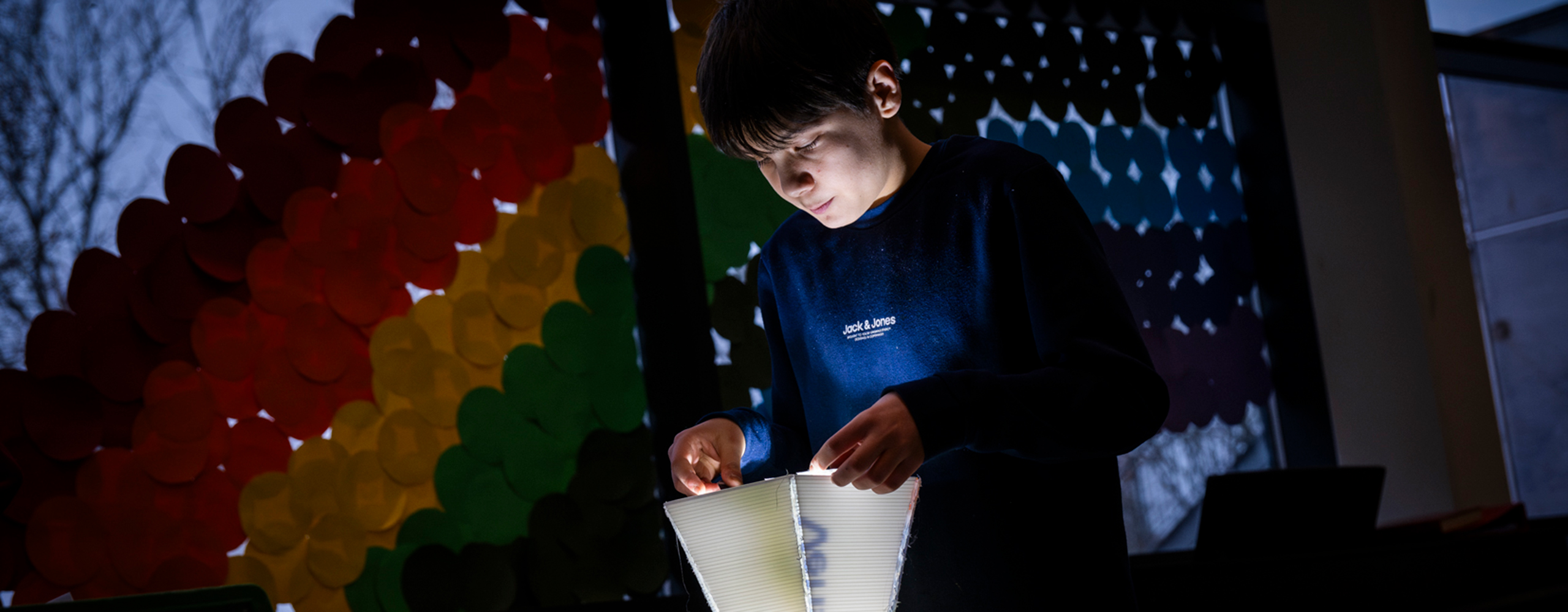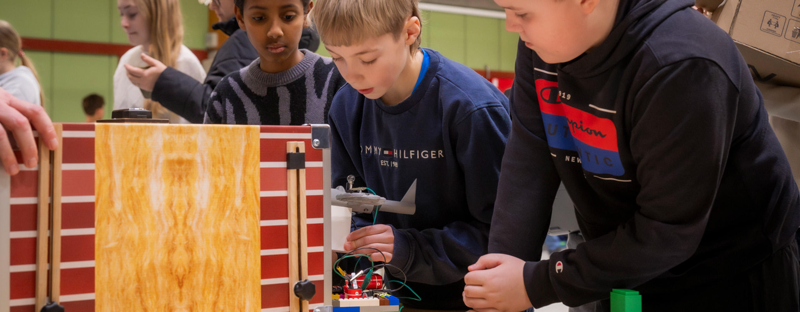 Hallen summer af spænding og glæde. Elever fra Skægkærskolen og andre skoler i Silkeborg Kommune kommer med favnene fulde af plancher, papmache og papir. Hver skole har et bord, som de fylder op med ekstra materialer, modeller af myrer, lamper, ventilatorer og tårne.