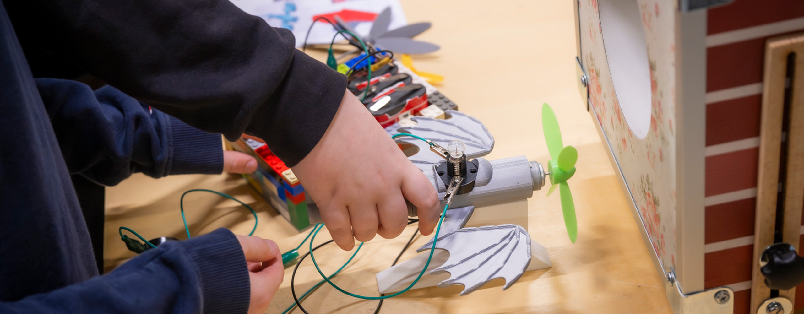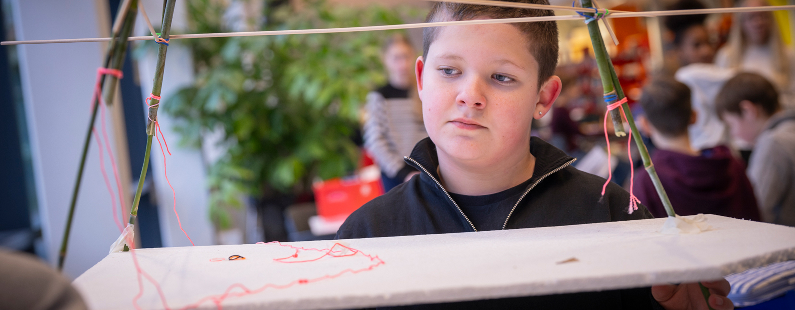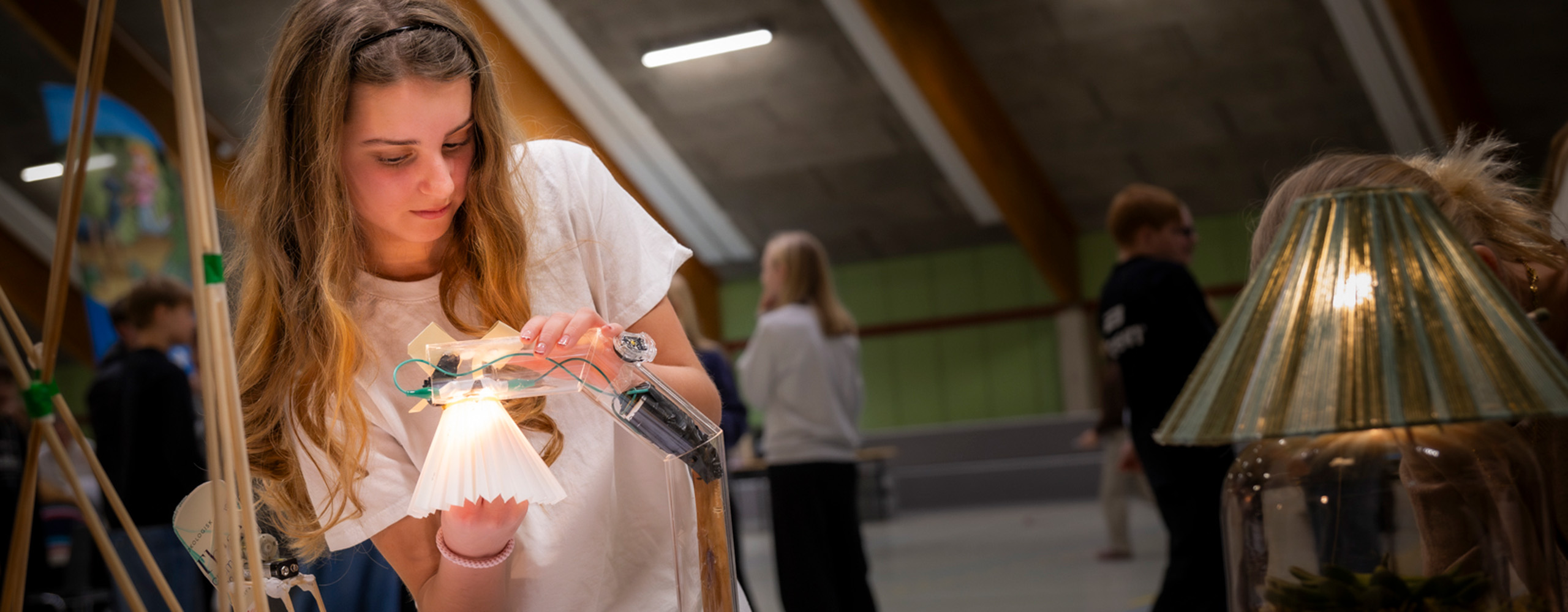 Mellem papmache, bambuspinde og ledninger går elevernes lærere rundt fra gruppe til gruppe. De er der for at understøtte og hjælpe. Men en vigtig del af Naturfagsmaraton er, at eleverne øver sig i at planlægge opgaveløsningen, tænke kreativt, være vedholdende og samarbejde.